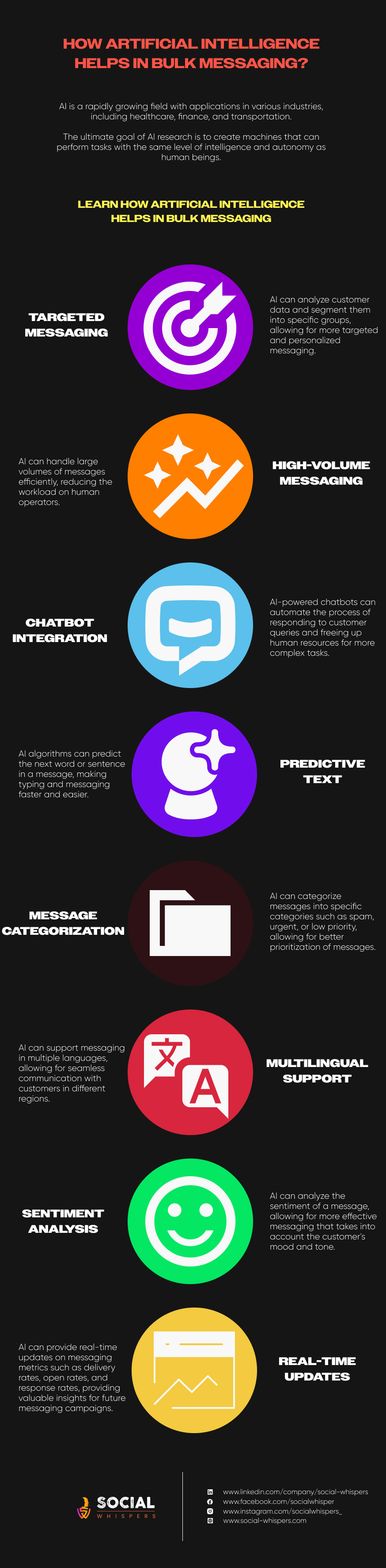 How Artificial Intelligence Helps In Bulk Messaging? #Infographic Leave a Comment / Marketing / By Chandan Artificial Intelligence (AI) refers to the simulation of human intelligence in machines that are programmed to think and act like humans. https://social-whispers.com/support@social-whispers.com